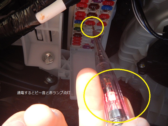 まずは常時電源10Aから。エンジンOFFでも電気が来てる部分をテスター(ピー音)を当て探します。