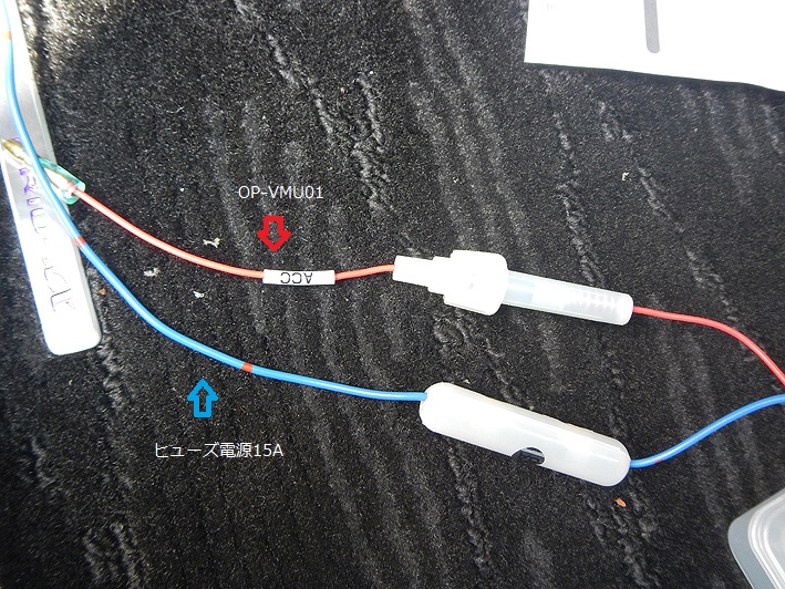※ ↑ 黄色コードがOP-VMU01、赤色コードがヒューズ電源10Aで共にヒューズ(白い部分)があります。