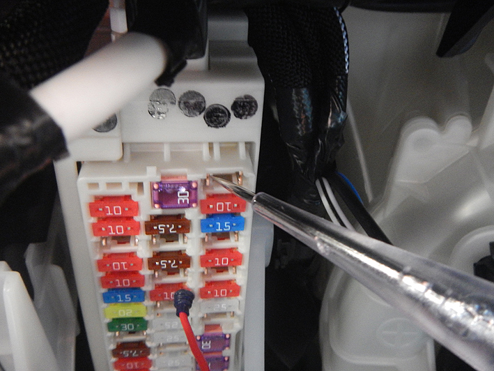 OP-VMU01(赤色コード)ACC側のヒューズを使うので、ヒューズ電源15A(青色)のヒューズを取り除き