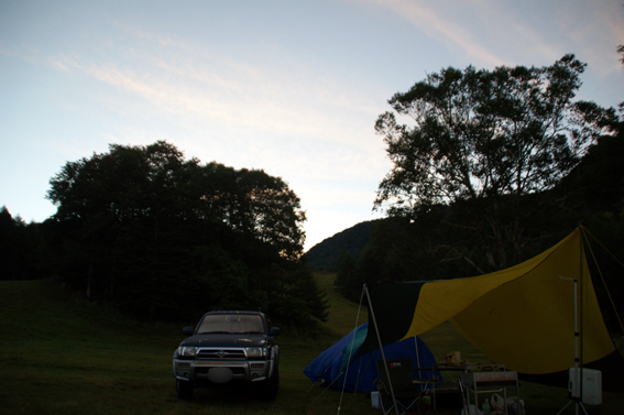 夜露でテントやタープがずぶ濡れです。今日は快晴だからすぐ乾くでしょう。