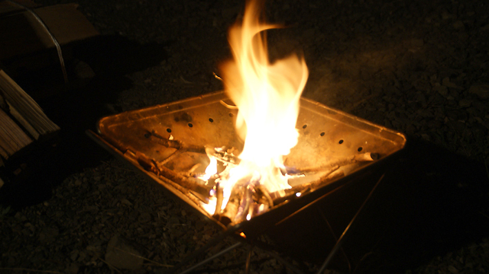 ここのキャンプ場は直火OKなのですが、石を重りの代わりに使っているため焚火台を使っての焚き火です。、
