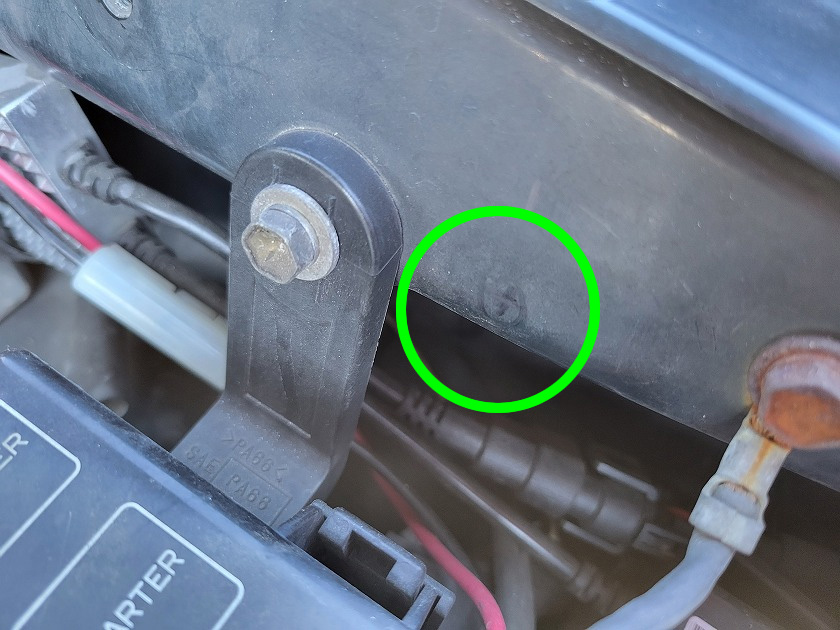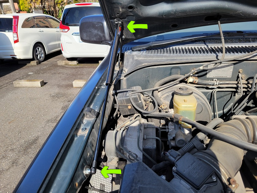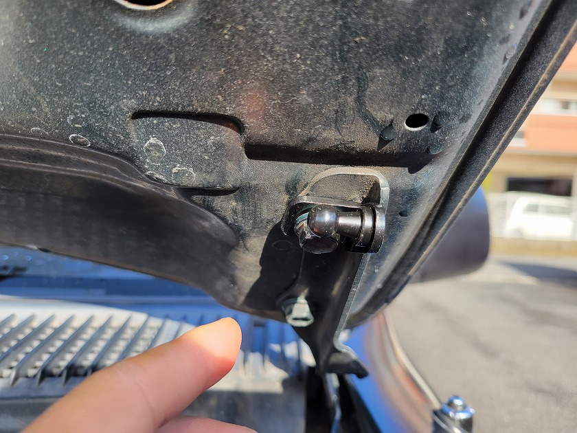 左側。矢印は車体に取付けるブラケットです。二種類あるみたいで穴に合う方を使いました。 片側だけでもボンネットは持ち上がりました。それでは反対側も取付けましょう。