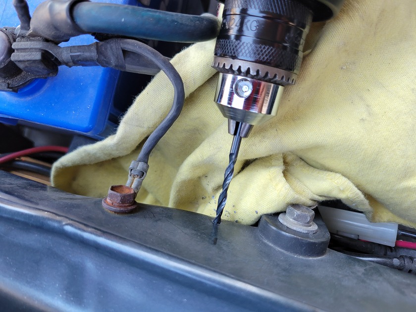 ドリルで穴あけ。ブラケットのネジは5.0mmだったのでキリも5.0mmを使います。