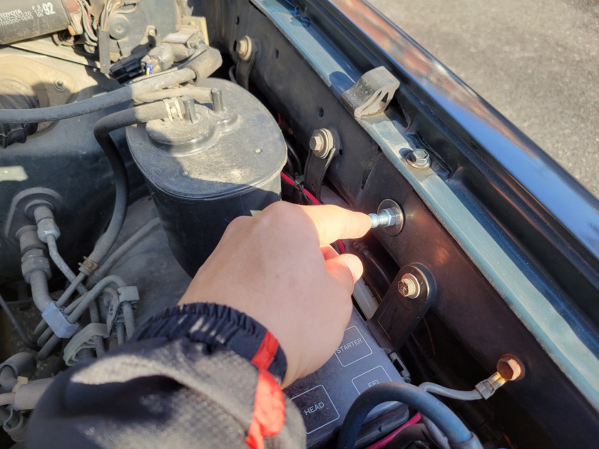 ボンネットの支えてるナットを一ヶ所取外します。