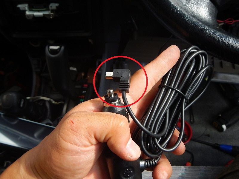 で、試しにルームミラーにドラレコを取付けてみました・・・が、ここでトラブル発生!? 電源を差し込んだら上部側のカバーにあたり電源コードの付けて部分の曲がりが凄いことに。
