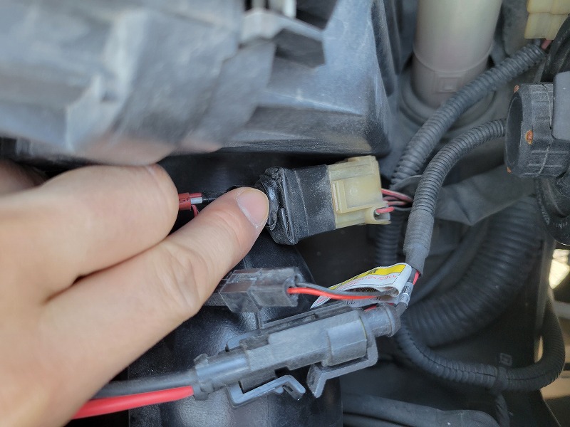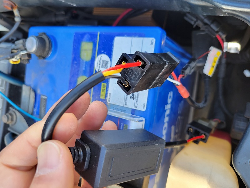 では、早速取付け開始です。ヘッドライト電源カプラーとリレーレスユニットのコードを 外します。