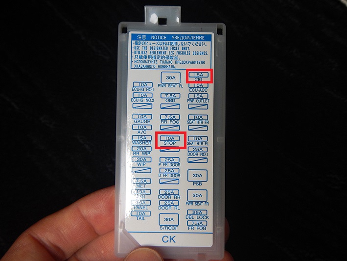 ヒューズBOXの内容はこんな感じです。まずは常時電源の10Aと、ACCをCIG15Aから取ります。