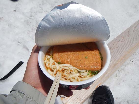 山小屋でどん兵衛 きつねうどんを購入。お湯付き。 疲れた後の塩分がたまらなくうまいですね。
