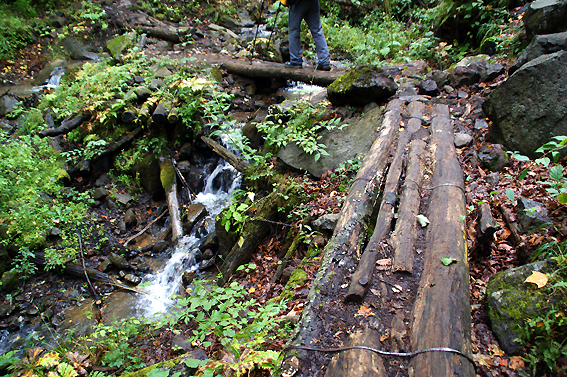 おっと!丸太の橋です。これはかなり滑りやすいので気をつけましょう。