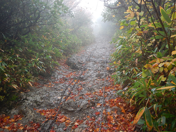 八海山の山頂は雲の中ですね。 夜中大雨でしたからね。しかたありません。これで岩場がびしょ濡れ確定です。やれやれ。