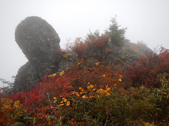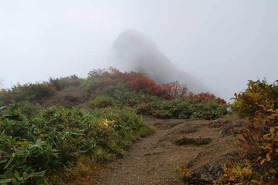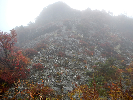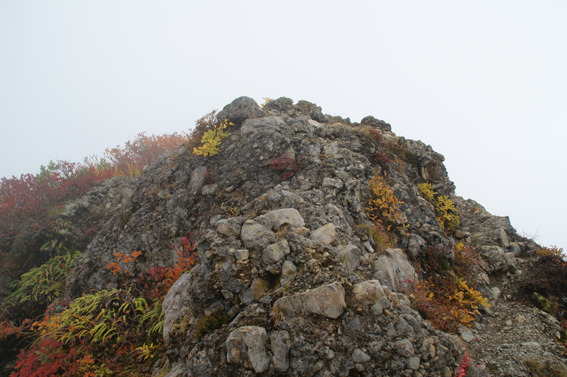 雲の向こう側に八海山最初の岩場、地蔵岳が姿を現しました。