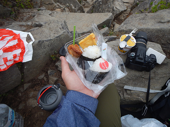 珍しくお腹が減っていたので食します。カップラーメンが暖かくて助かりました。 山頂で冷やし中華を食べようかと思っていただけに助かった~。