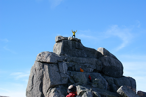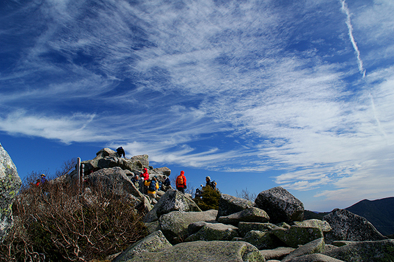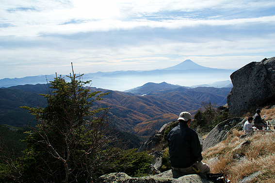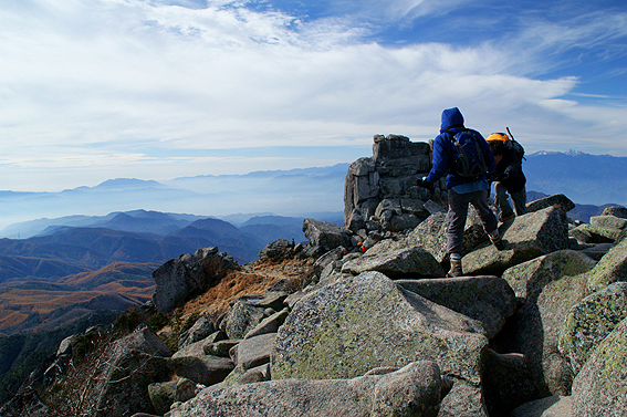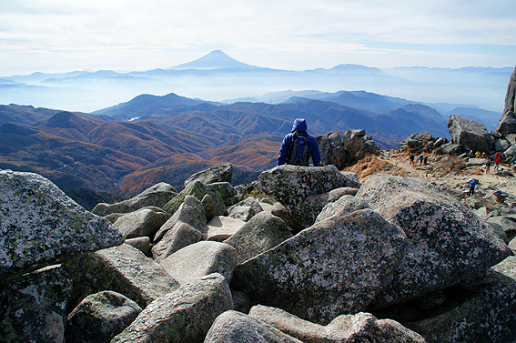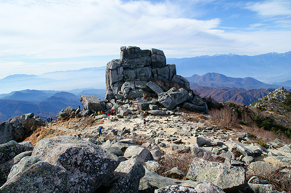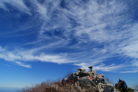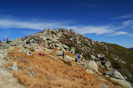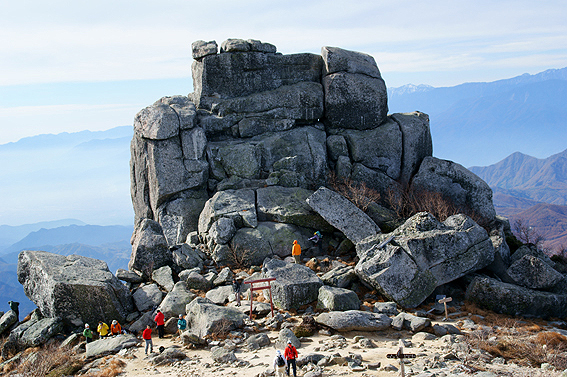 すでに山頂に着いた登山客が五丈岩に集まっていました。