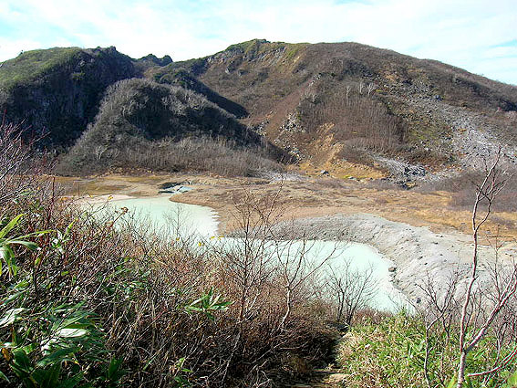 下って行くと硫黄の臭いがしてきました。ここは昭和湖かな?
