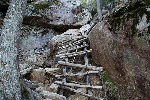 ボロボロの木のハシゴですね。ロープを掴みながらでないと危ないです。