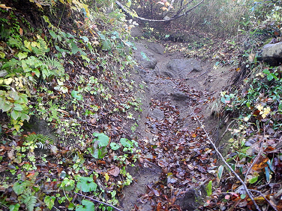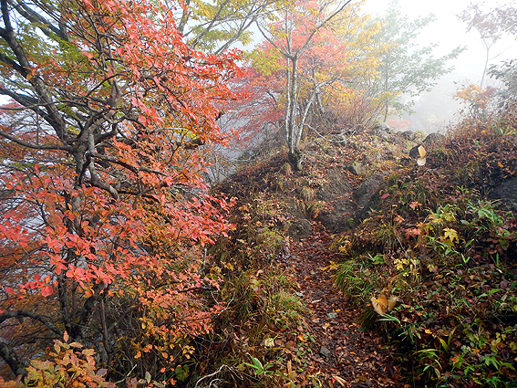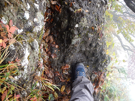 ここの足場も狭い!霧のおかげで下が見えませんがかなり崖ぎりぎりを歩いてます。