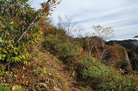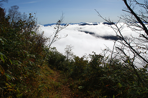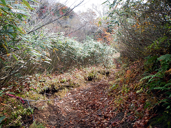 ところどころ笹が邪魔して足元つるつる。右側崖だし危ない。
