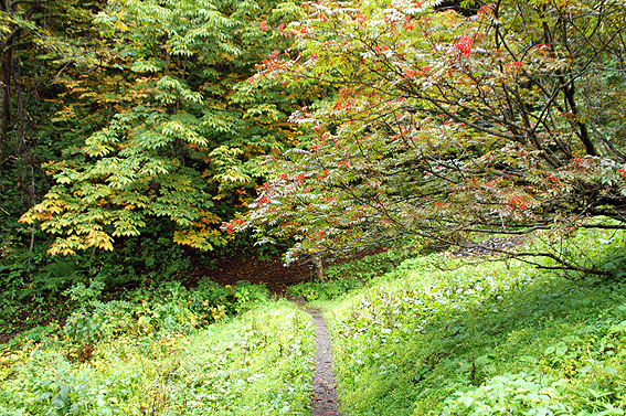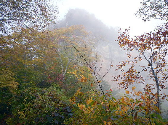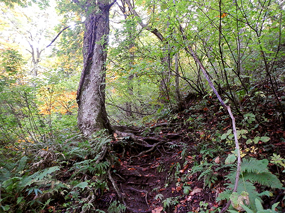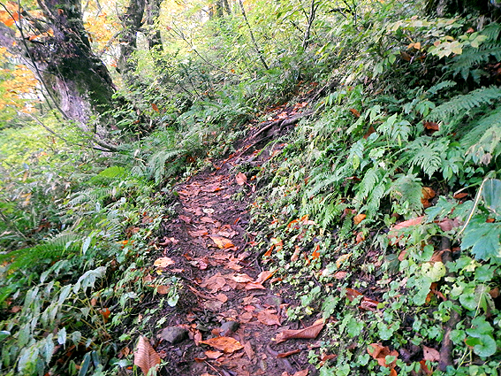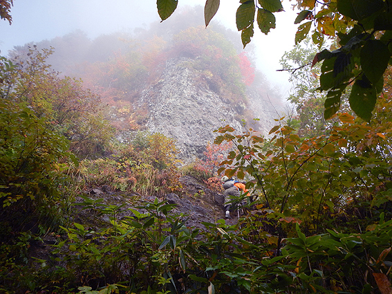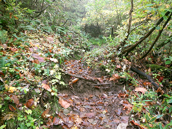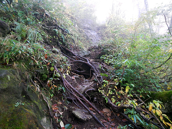 しょっぱなから急斜面の登りが続きます。前日雨で今は霧の中。山道ぐちゃぐちゃですね。やれやれ。
