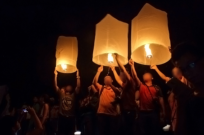 お祭りを寺院内で見れなかった為寺院前から参加。撮影はコムローイ(熱気球)が空に向かって上がって行く為夜景撮影方法は無理。