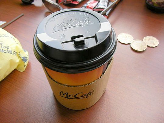朝マックのコーヒーです。日本と作りが違いますね。そして、ミルク入った状態で渡されました。