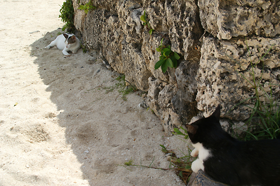 自転車を停めて海へ向かう途中ネコ達の争いが・・・。