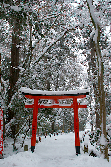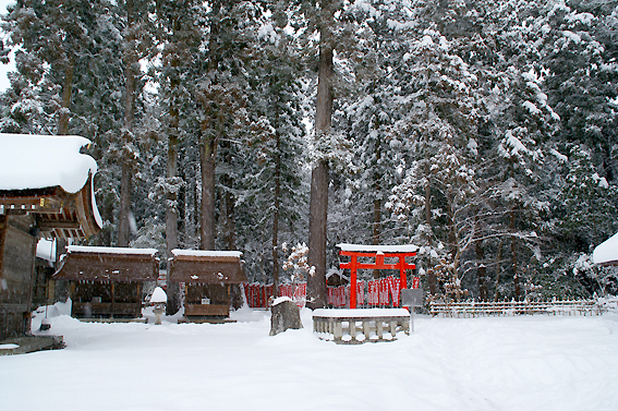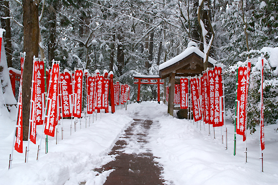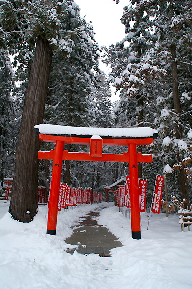 雪景色にひときわ目立つ真っ赤な鳥居がなんとも言えませんね。