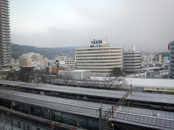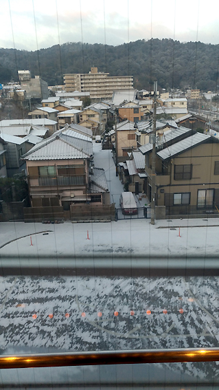 部屋から見た景色です。雪は・・・・微妙だな〜ちょこっとだけ降ってますね。やれやれ。