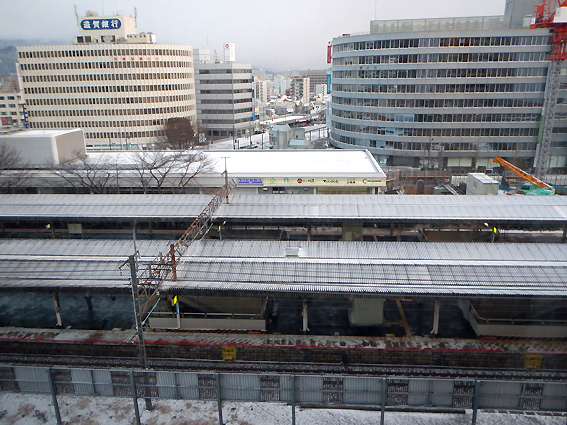 あらら、雪が降ってきた。琵琶湖の反対側結構さかえてますね。