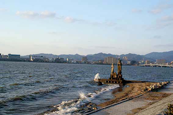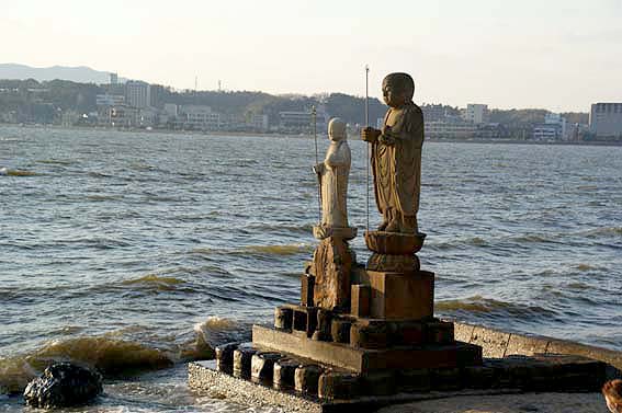 お地蔵様、嫁ヶ島越しの宍道湖の夕日を撮ります。旅の締めくくりにはちょうどいい風景ですね。
