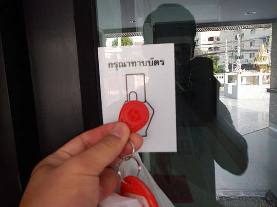 このホテルオートロックみたいで、この赤いものをかざすとドアが開きます。ここじゃなくて部屋の鍵に金を掛けろって言うの。