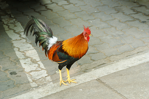 いきなりのお出迎え。立派な鶏です。伊勢神宮にも似たような鶏が放し飼いになってたけど、