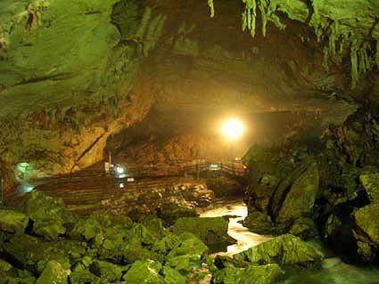 ひんやりと肌をさす冷気漂う杉木立を通りぬけると、秋芳洞入り口。洞内の観光コース1km
