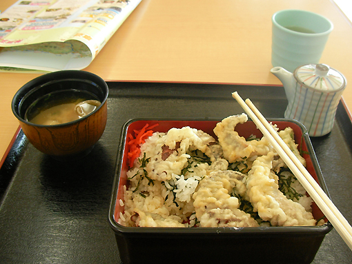 途中SAで昼食に。ここはタコが名物だそうです。なのでタコ天重を注文。