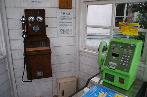 駅前の公衆電話BOXもアンティーク風で中に入ると昔の電話が。