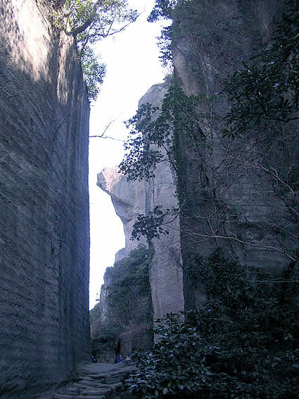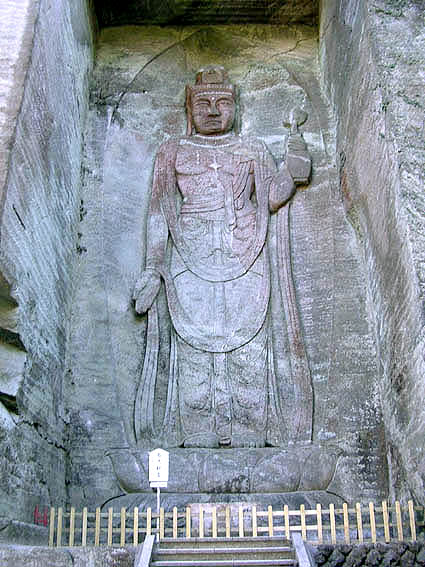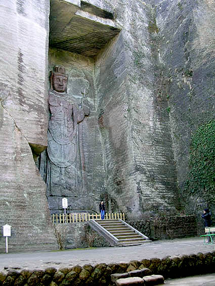 入り口から数分、切り立った断崖は石切の跡で間をぬっていくと馬鹿でかい観音像百尺観音が現れました。 岩を削って造られたのでしょう。とても大きな観音像でした。写真で全体を収めるのに苦労しました。