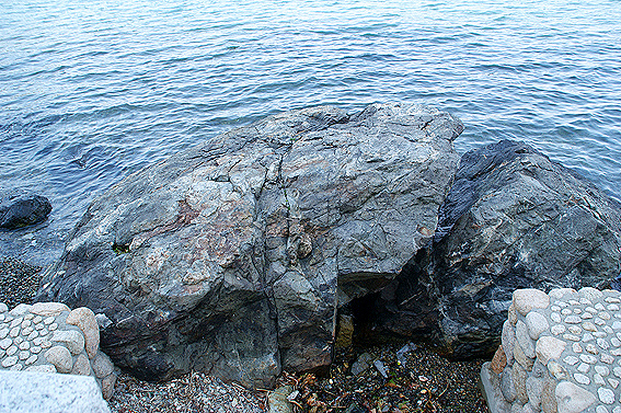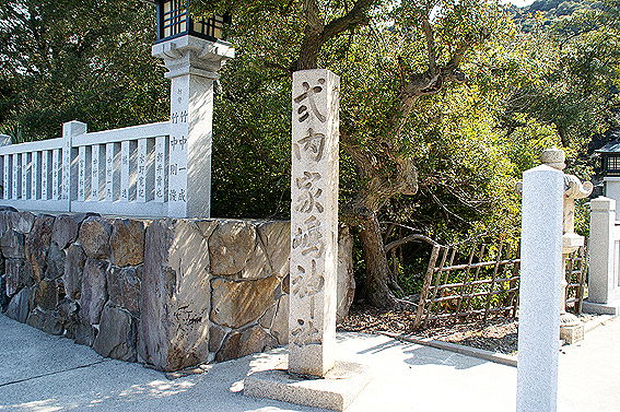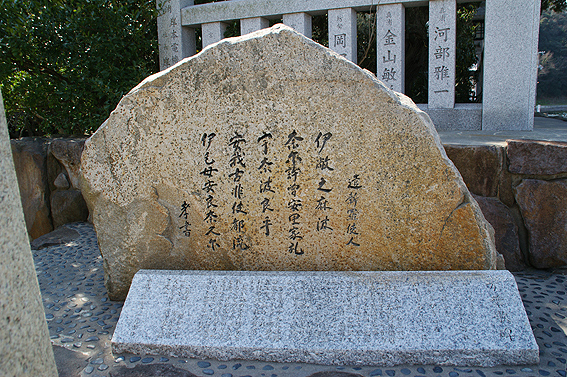 由来:菅原道真公が大宰府に左遷される途中にこの岩場より上陸され詩を詠まれたと言う伝承からこの辺りを 『 詩ヲ書キ場 』そして、この岩を『 詩ヲ書キ石 』と申し伝えられているそうです。