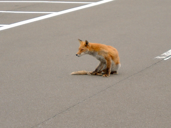 駐車場に車を止めて外に出ると何やらざわざわしてるぞ・・・っと思ったら狐がいました。