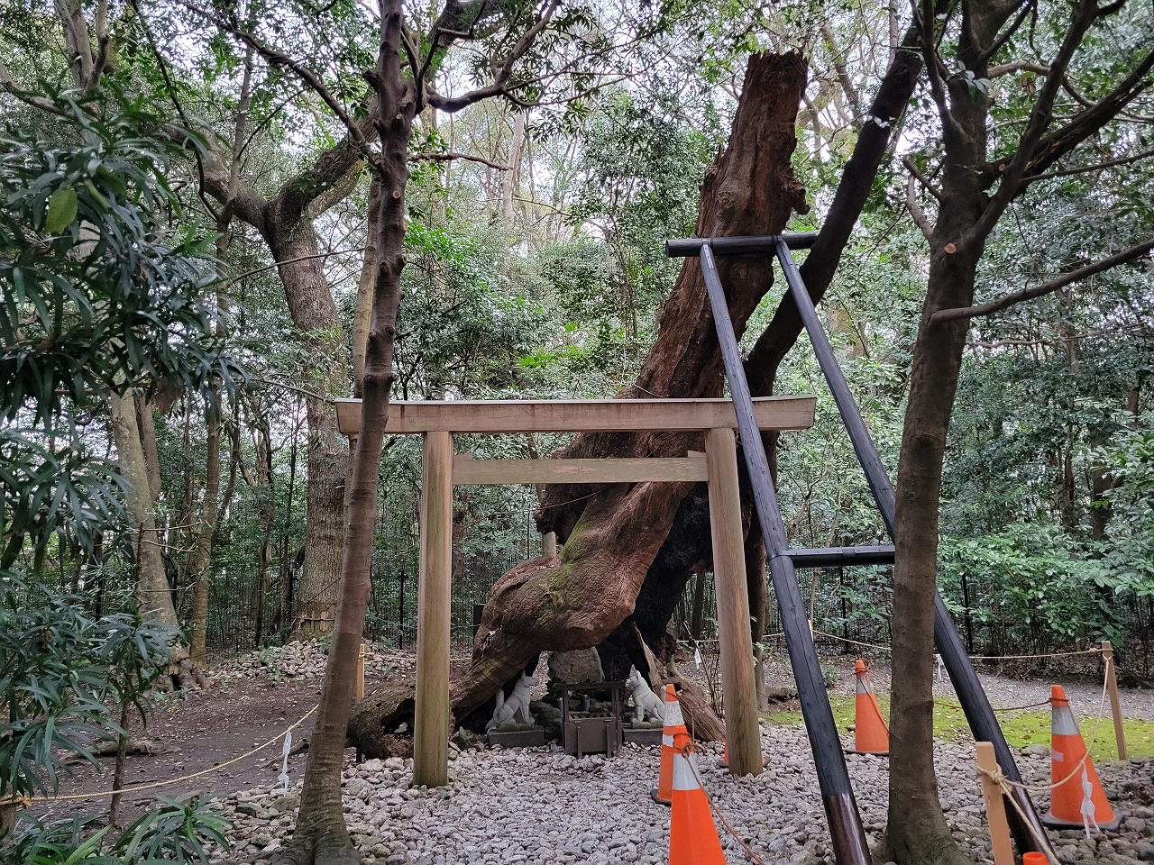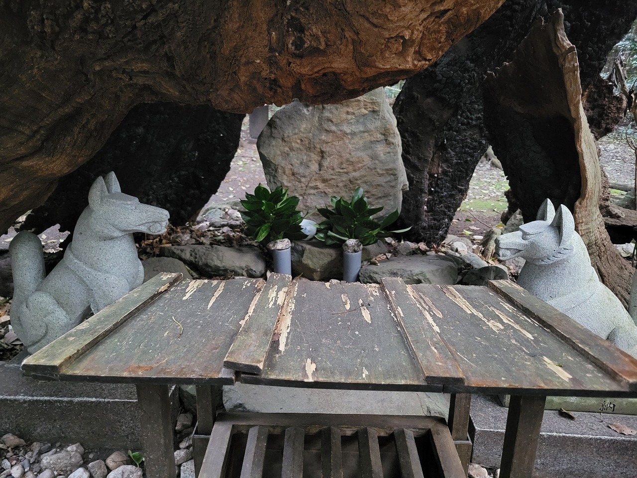 焼けた樹木の下祠?