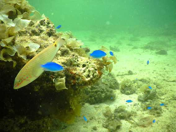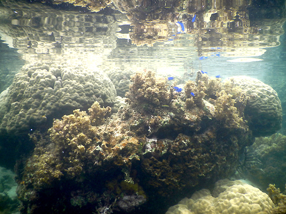 石垣港離島ターミナルから車で約1時間位で到着。米原ビーチです。 ここは浅瀬でサンゴ礁や魚が見れるそうなのでさっそく潜る準備です。