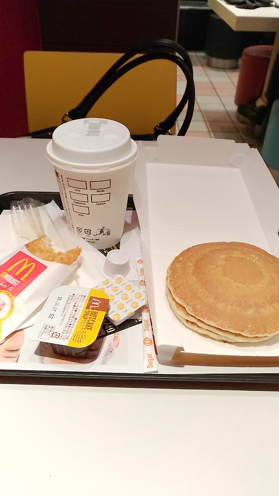 歩き回ってようやく発見。パンケーキセットを購入。