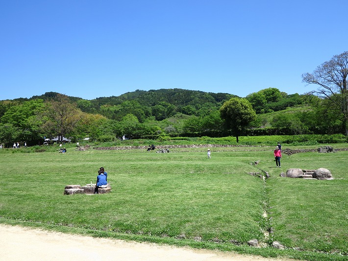石舞台古墳に到着です。車を止めて古墳に向いましょう。だだっ広い公園も隣接していて 休日の家族連れでいっぱいです。のどかだな~。