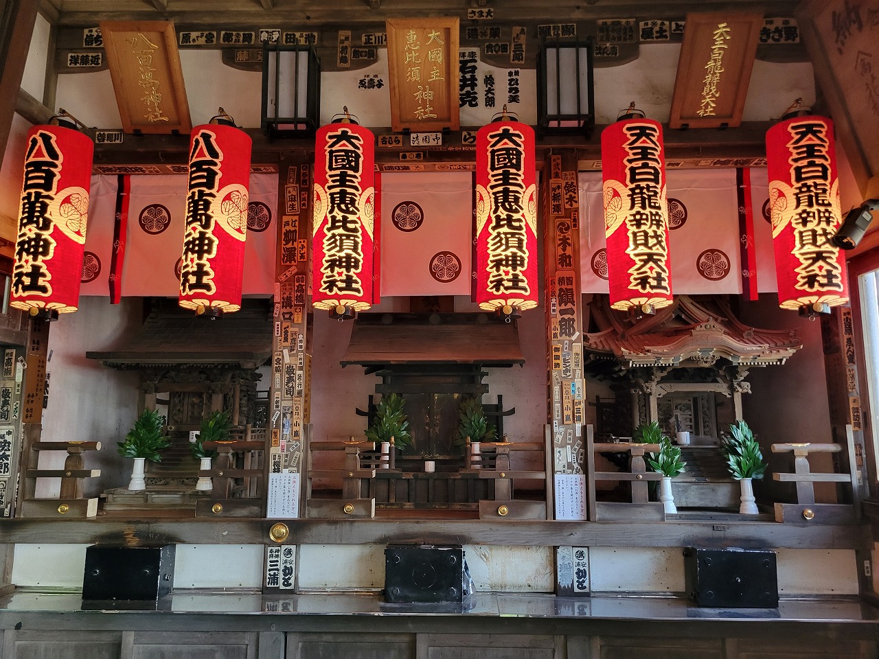 八百萬神社(左)、大国主恵比須神社(中央)、天王白龍弁財天社(右)