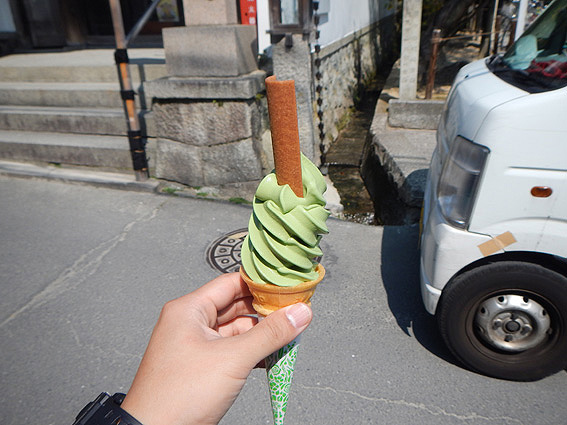 気になった抹茶アイスをいただきます。八橋が刺さっとる。嬉しいですね。