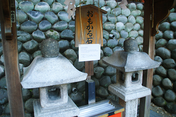このおもかる石です。これは、願い事をした後灯篭の頭の丸い石を持ち上げて思ったより軽いと 感じれば願いが叶うというものです。