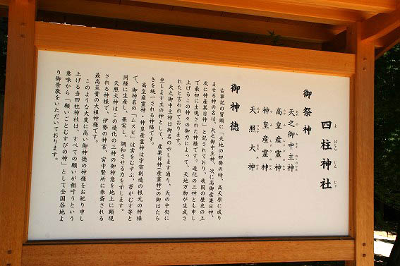 祭神:天之御中主神(あめのみなかぬしのかみ)、高皇産霊神(たかみぬすびのかみ)