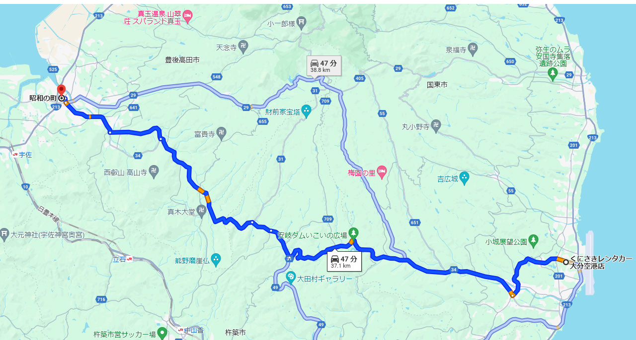 昭和の町からくにさきレンタカー店にナビをセット。1時間くらいかかるのか~ 意外と時間ないかも。とりあえず安全運転で向かいますよ。