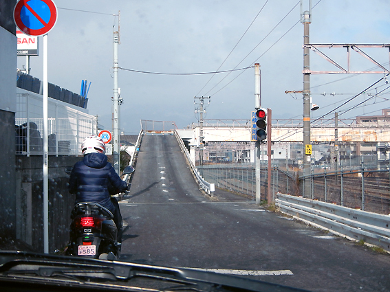 この陸橋は車一台しか通れないので信号が変わるまで待ちます。