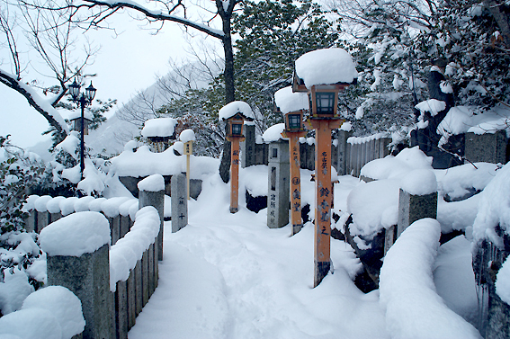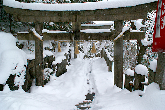 雪が積もっているおかげで鳥居がこんなに低くなってました。