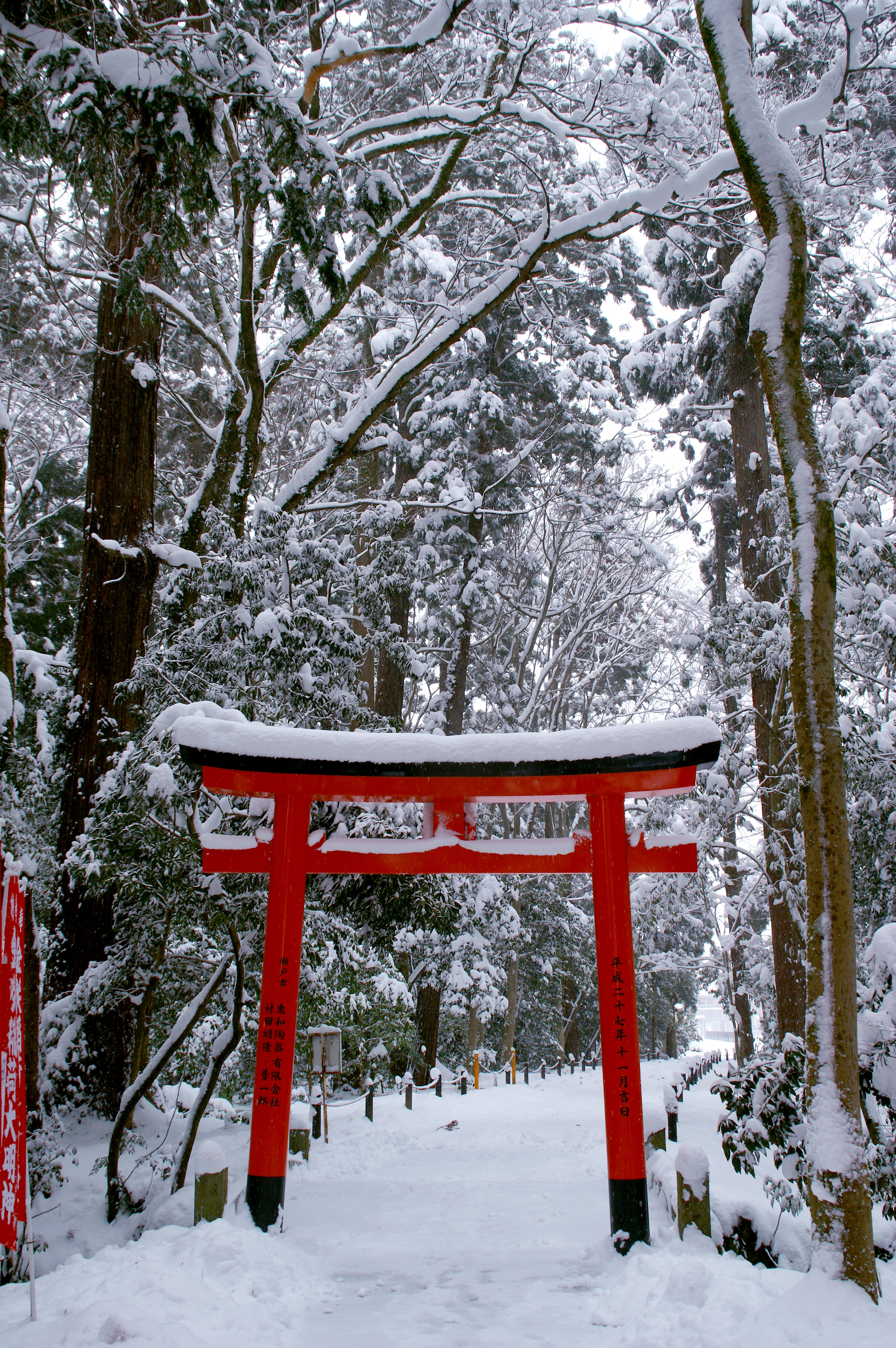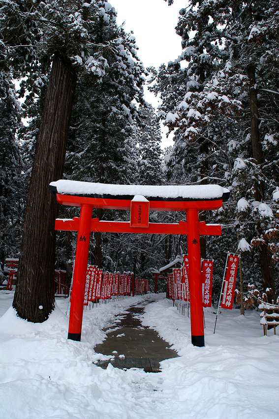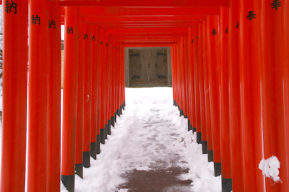雪景色にひときわ目立つ真っ赤な鳥居がなんとも言えませんね。 鳥居がたくさん並んでる社はたいてい稲荷神社でしょうね。向かってみましょう。