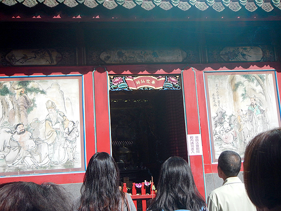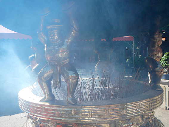 相変わらず人が多い。入口で三本の長い線香を頂きました。お参りです。